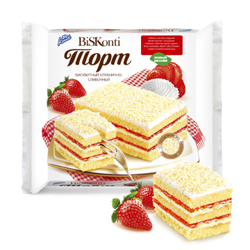 Воздушный бисквитный торт с насыщенным клубнично-сливочным вкусом, украшенный белым шоколадом.