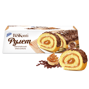 Воздушный бисквитный рулет с нежным вкусом крем-брюле и посыпкой из кусочков молочного шоколада.